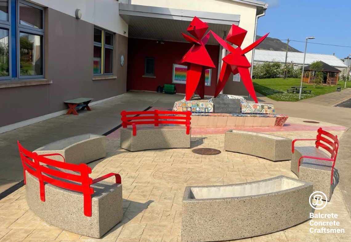Balcrete provided bespoke polished radius benches and planters, enhancing Clonmany National School’s outdoor area with functional and stylish seating solutions. The steel back and armrests of the benches were galvanized and powder-coated in a vibrant red to match a nearby monument. This project  added aesthetic value and comfort for the students and staff.