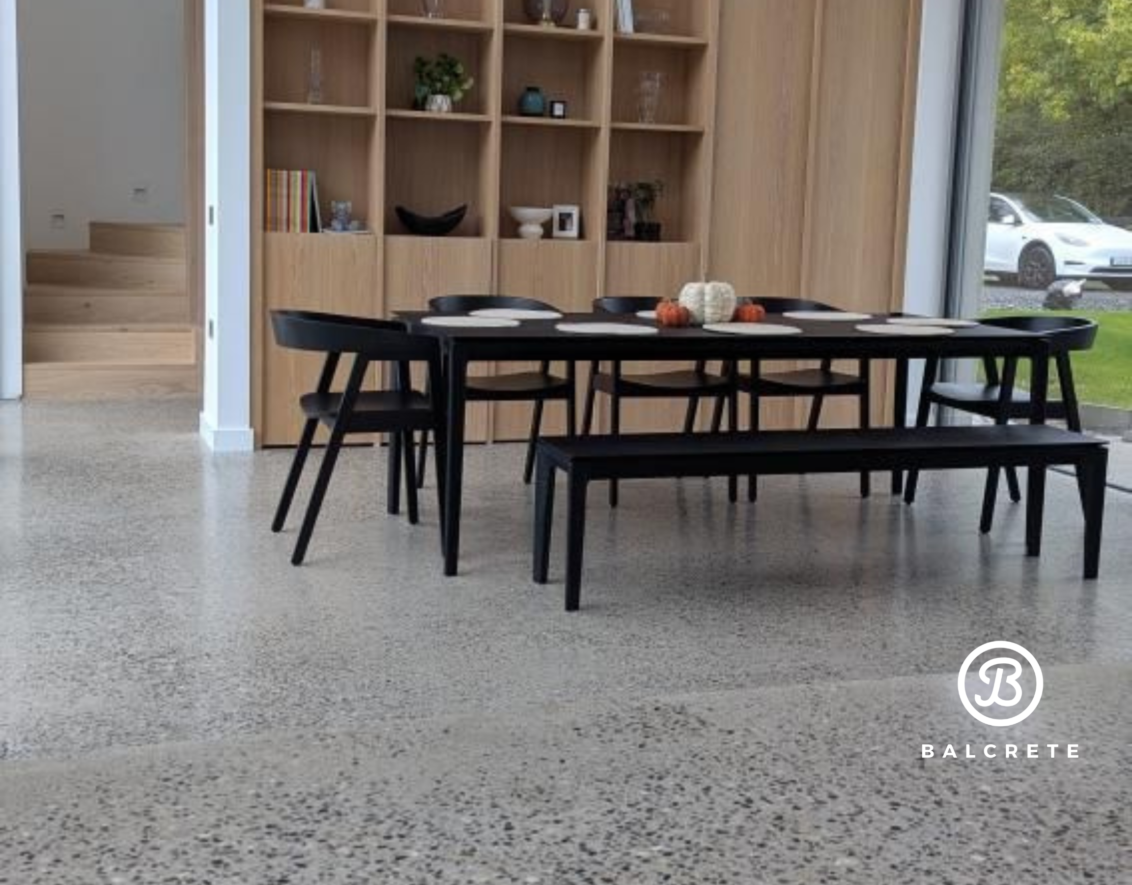 Benefits of Polished Concrete include enhanced durability, low maintenance, and a sleek, modern aesthetic that complements the contemporary design of the home. The polished surface also offers increased light reflection and improved air quality, making it an ideal choice for both style and functionality.